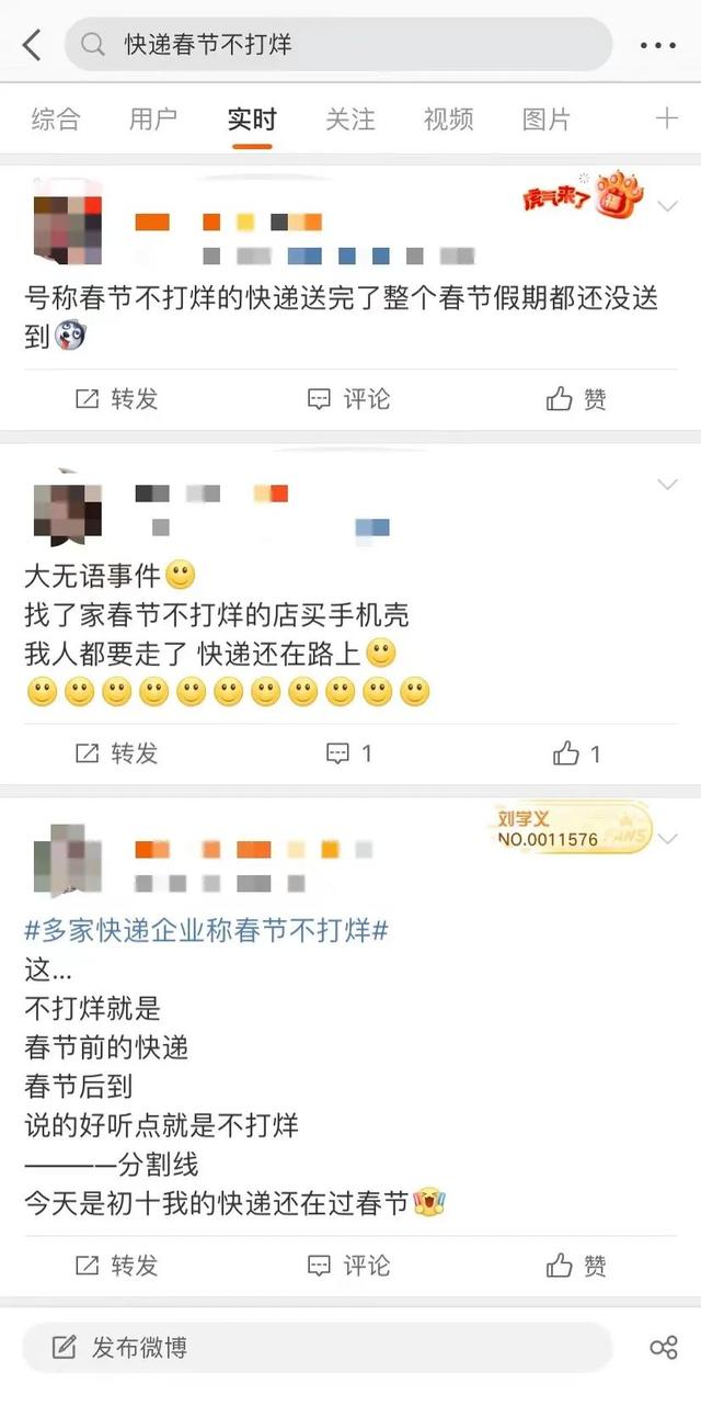 社交平台上还有许多相关投诉,比如,“家里年前寄的年货,年后都没收到,要不是听说快递不打烊就不寄了。”“快递确实发货了,但揽收了近10天。”“确实没打烊,只是不派送而已,还未经同意帮我签收了。”“原来不止我一个人,说好的春节不打烊,物流信息一直不更新,上班了也不派送。”还有消费者直言,“号称春节不打烊却没有人配送,这样是不是虚假宣传?”