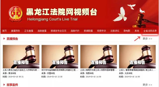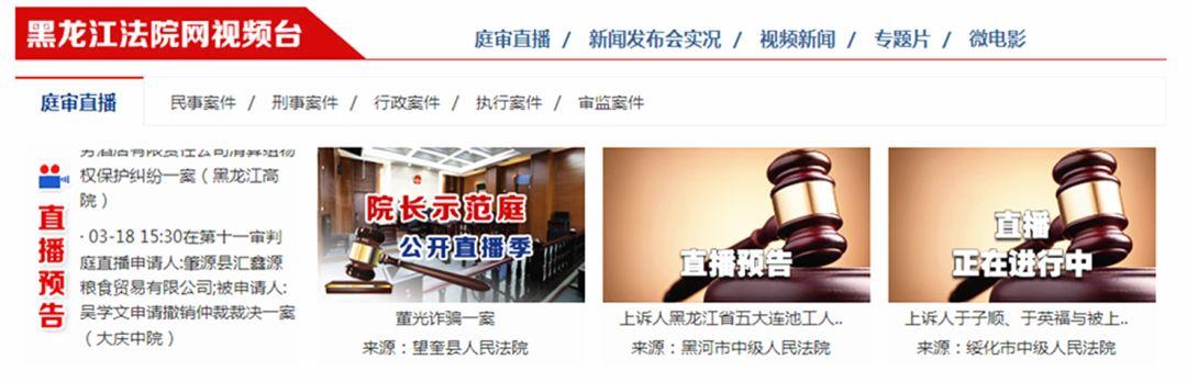 下拉找到“黑龙江法院网视频台”板块,点击“庭审直播”