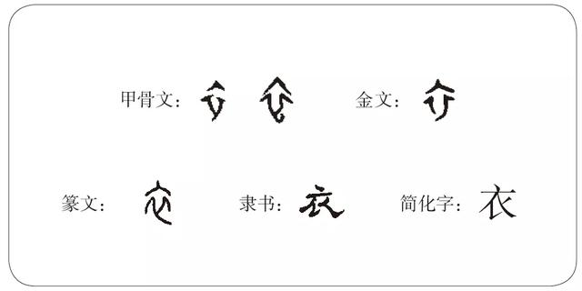 等形状。整个字形像一件上衣,上面的人字形部分是衣领,两侧开口表示两个袖筒,下面像左右衣襟交叠的样子。“衣”的字形从甲骨文到小篆一直比较稳定,基本保持象形写法。后来经过隶变,笔画变得平直并有连接,才失去了象形性,最终成为今天的样子。