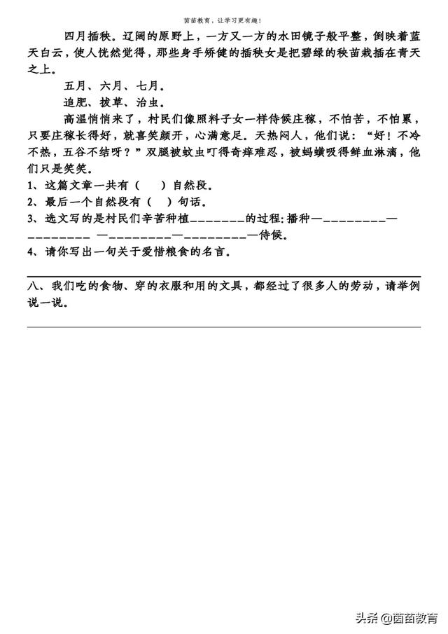 3、选文写的是村民们辛苦种植水稻的过程:播种—插秧—追肥 —拔草—治虫—侍候。