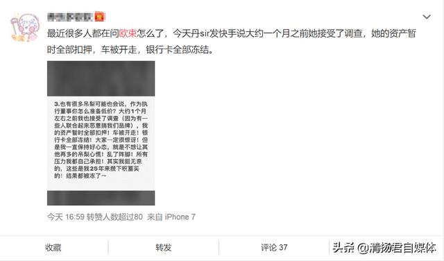 今天还有不少微博认证用户称:今天 丹sir 发快手说大约一个月之前她接受了调查,她的资产暂时全部扣押,车被开走,银行卡全部冻结。
