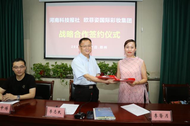 2021年6月7日9时,在热烈的掌声中,河南科技报社社长李志民与欧菲姿国际彩妆有限公司河南区总负责人李馨月将郑重签下自己名字的战略合作协议书交付到对方手中,同时亲切握手合影,至此,河南科技报社与欧菲姿国际彩妆有限公司战略合作签约仪式圆满成功。