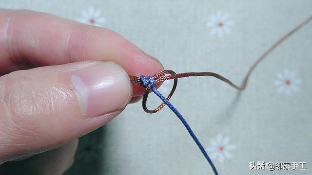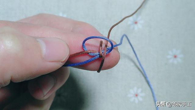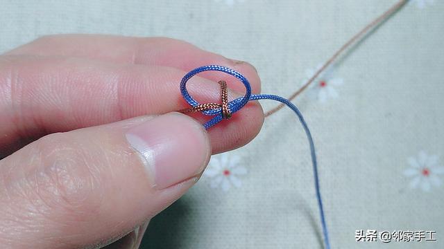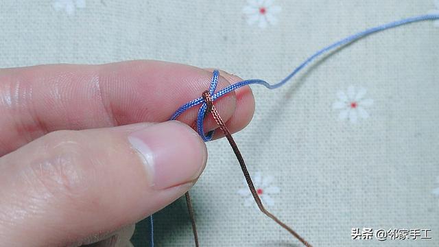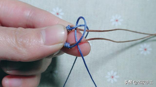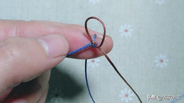 1、我用的是72号线,粉蓝色和驼色,先来学习下金刚结的编法。驼色绕粉蓝一圈,如图操作。