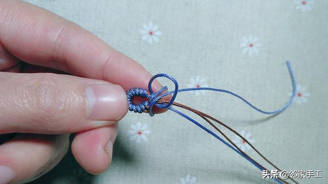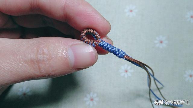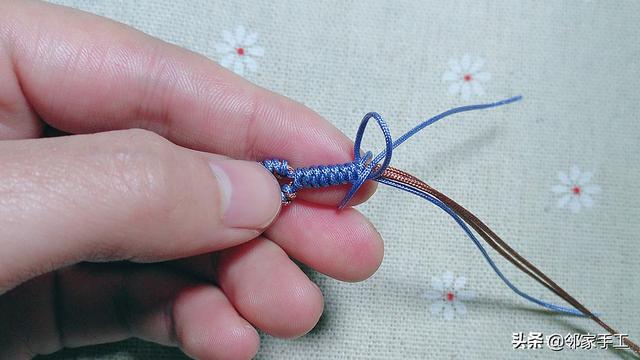 11、以驼线为中间的芯线,取两侧的蓝线开始编,和金刚结的编法一样,先把驼线放在中间不动,下侧的蓝线绕个圈包住剩余3根线。