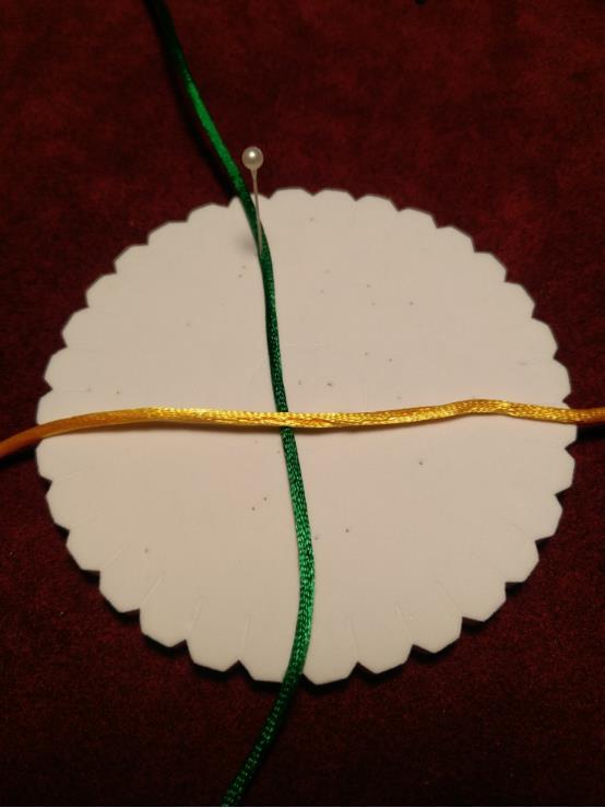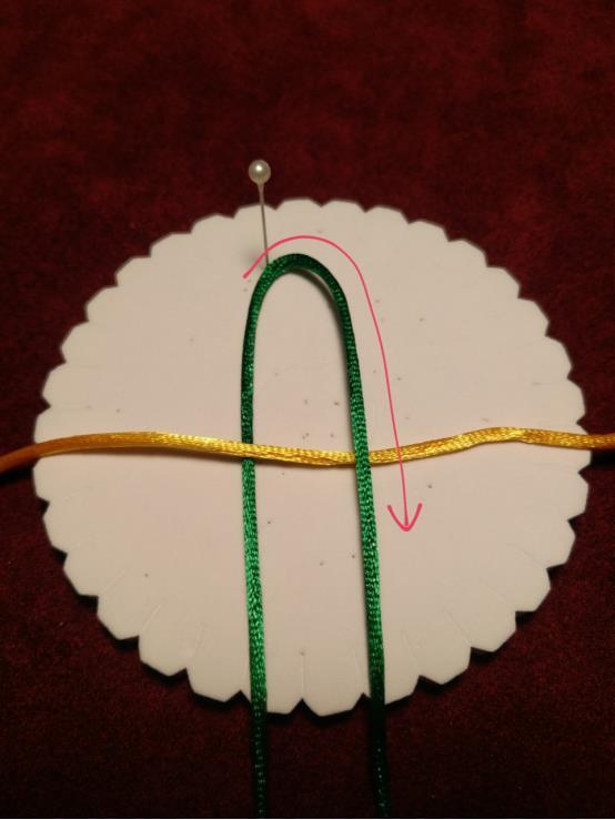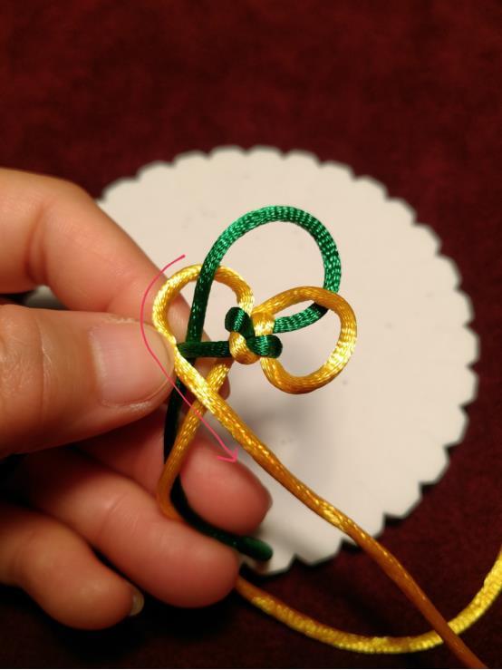 10、被压住的绿线逆时针方向穿进第一个黄线圈里。