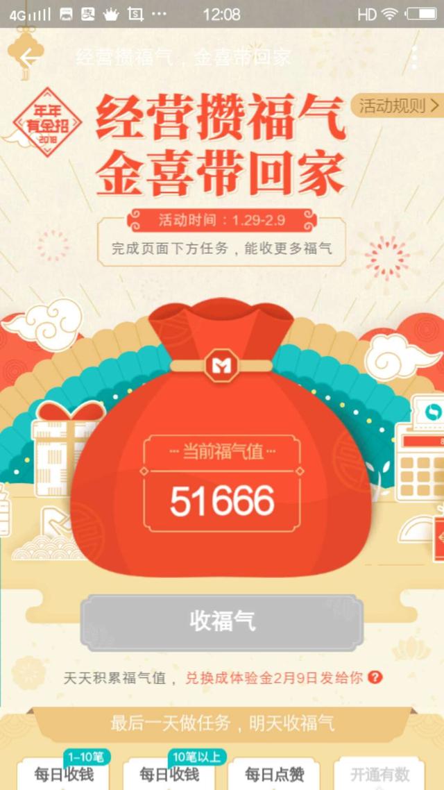 今天,按惯例收了福气,又一个红包快到手了。这是支付宝一月二十九日,推出的“经营攒福气,金喜带回家”收福气、发红包的活动。