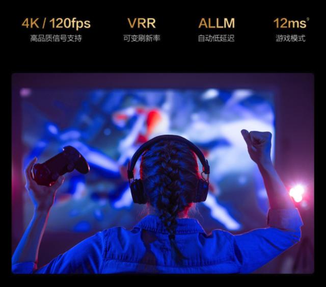Redmi游戏电视采用120Hz刷新率面板,支持MEMC动态补偿,拥有94% DCI-P3色域,△E≈2;音响系统由2*12.5W扬声器组成,并采用双风管低音增强设计;支持杜比视界及杜比全景声;提供1个HDMI2.1接口,支持VRR可变刷新率和ALLM自动低延时,并通过AMD的FreeSyncPremium认证。