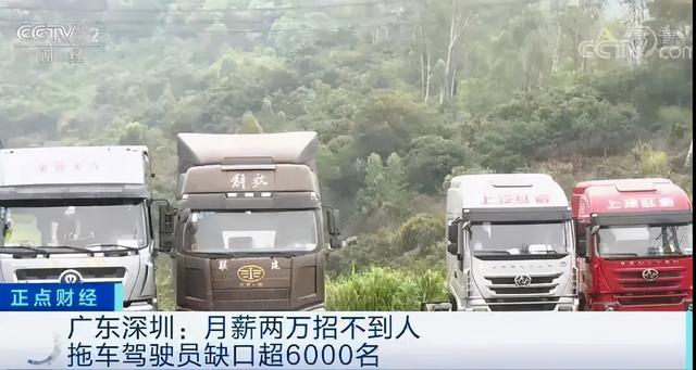 深圳一家物流公司有92辆拖车,但是拖车司机却不到60个。他们招聘信息显示,驾驶员月薪20000左右,并提供免费宿舍。