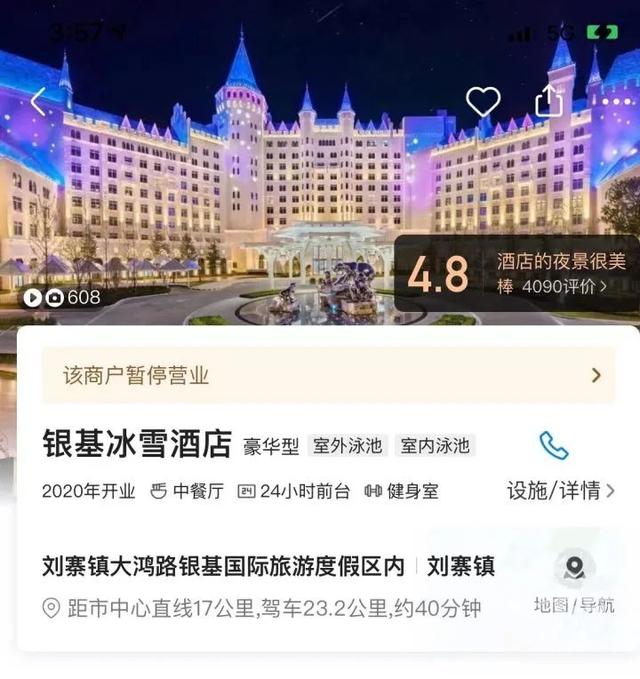 截至发稿前,在大众点评查询“银基冰雪酒店”,显示暂停营业。查询“银基冰雪世界”,显示闭园防疫,景区正在有序准备中。