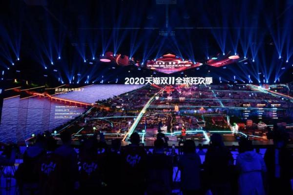 11月11日,在浙江杭州未来科技城学术交流中心,大屏幕显示阿里巴巴旗下天猫“双11”期间湖北武汉的交易数据。新华社记者 黄宗治 摄