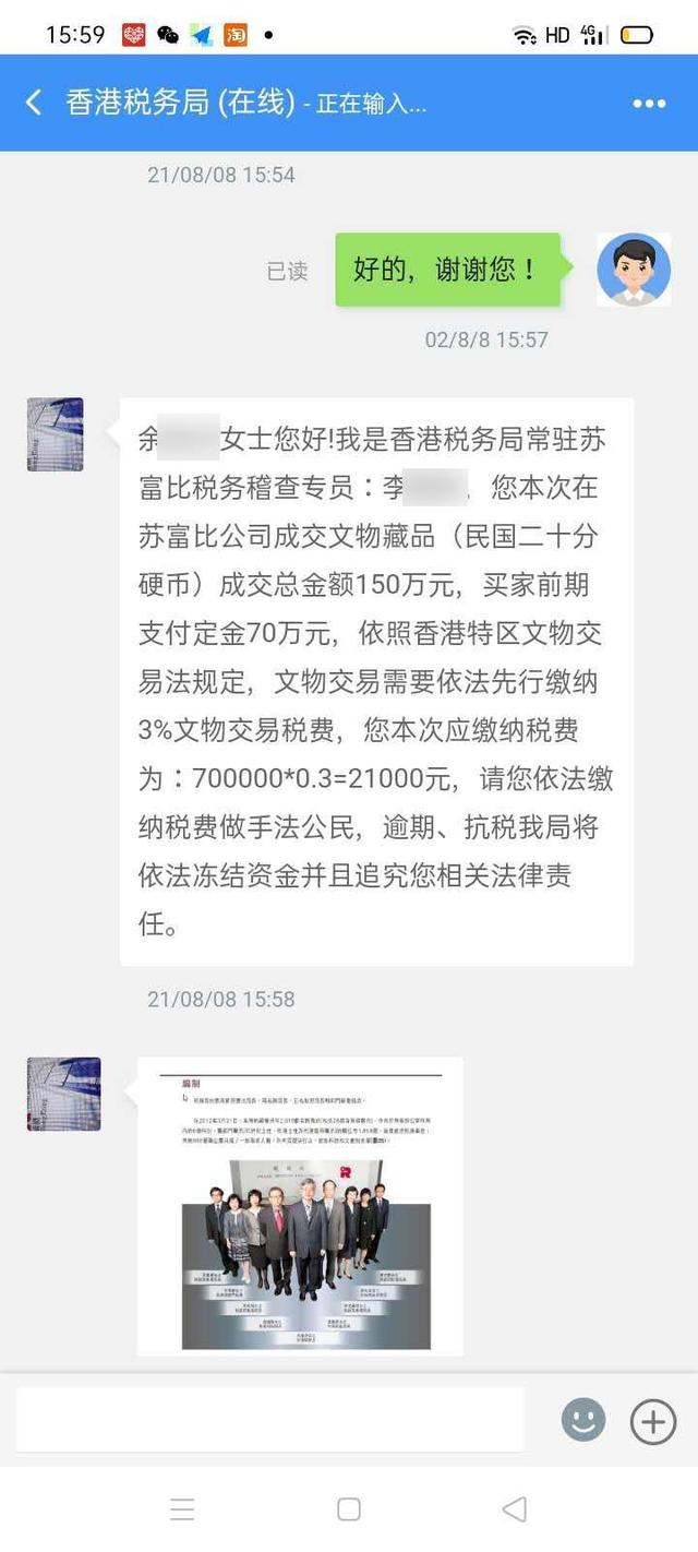 8月8日,余女士惊喜地发现钱币被人拍下,且成交金额达150万元。随后,余女士被拉进微信群,群内一名叫“李总”的人提醒余女士,要先交2万元的保质金,随后买家就会通过公司将70万元定金转给余女士,买卖双方交易成功后,再以同样的方法将剩余的80万元转给余女士。