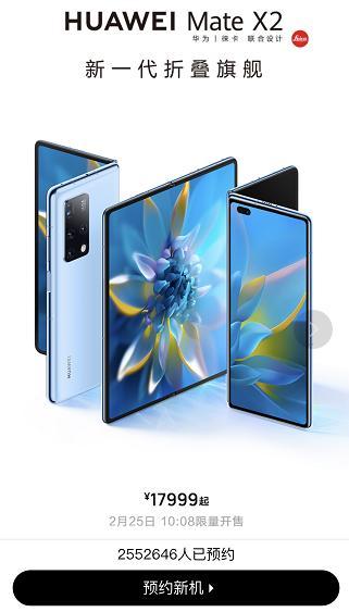 截至2月22日晚间10点,华为官方商城页面显示,华为MateX2的预约人数超过255万人,在京东预约人数超过50万人。不过,预约人群中,有多少是真正会购买的,还未可知,毕竟预约并不需要付出成本,从记者体验来看,只需要注册相当平台账号后,轻轻一点,即可预约成功。