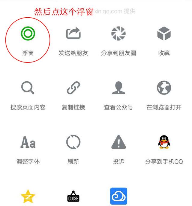 2、在弹出来的菜单里面选择浮窗,我这边用的是安卓版,苹果手机的稍有些不一样,不过也差不多的。