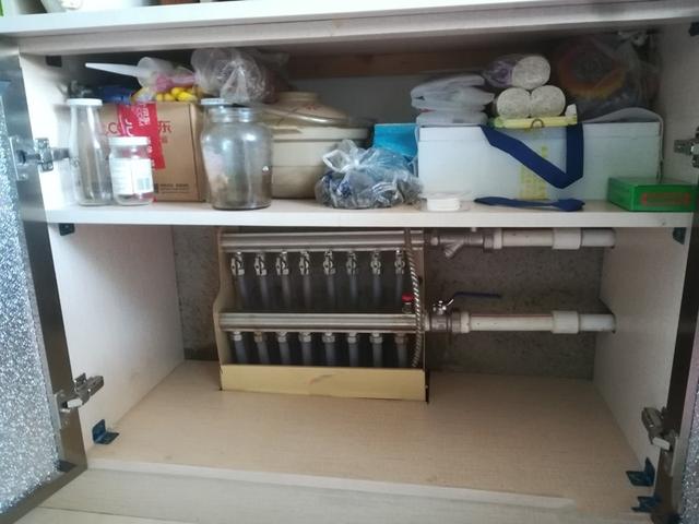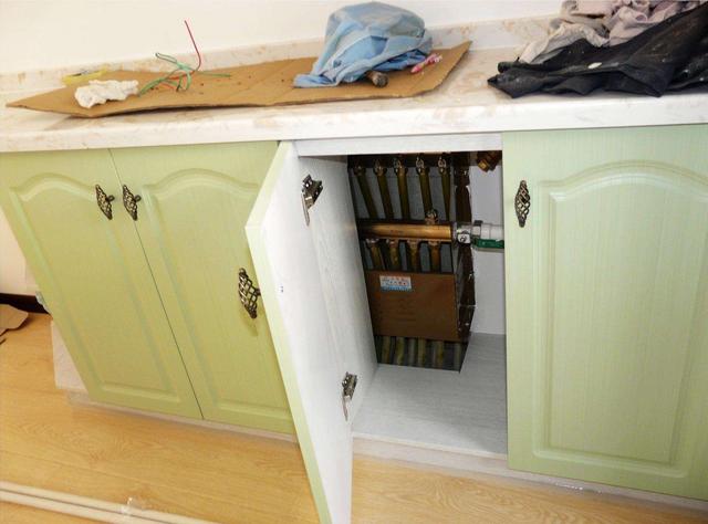 朋友家当初装修的师傅,将分水器装到了厨房地柜里,板子都是固定的,本来觉得没啥问题,但一到后面维修时,麻烦来了,全部的柜子都得拆▼