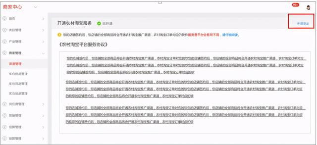1、点击“申请退出”:如果参加农村淘宝活动或已经报名了活动的淘宝商家,等到活动结束之后,才能申请退出来。