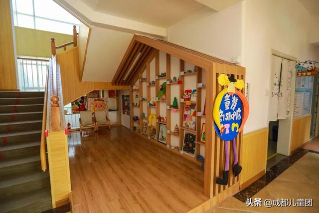 而幼儿园的艺术特色体现,不仅仅是在走廊上,它体现在方方面面,甚至包括楼梯拐角。这里有建筑的圆柱,原本空间没有用途,但老师和家长充分发挥创意,用报纸将柱子包裹起来,做成了大树的样子。顿时,一个阅读角就诞生了。