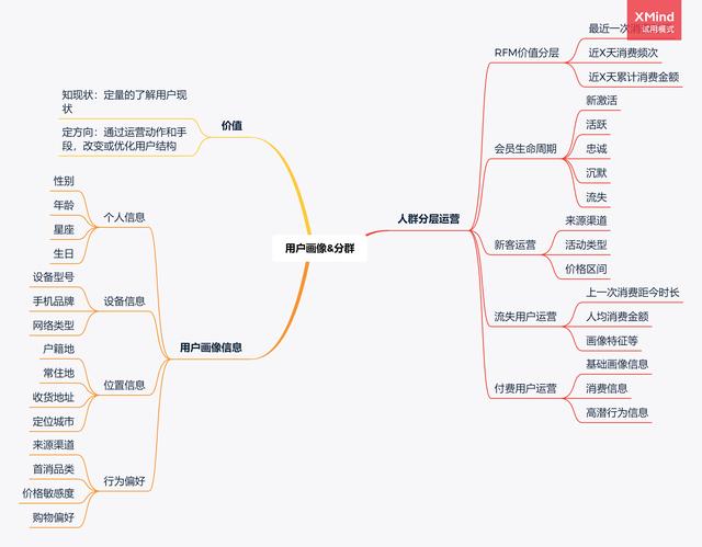 这时就需要用到用户画像和分群相关的数据能力输出了。首先,各个环节都需要了解用户的画像特征结构,这样才能清楚地知道目前用户现状如何,其次,以具体的运营目标确定用户分群,如利用RFM模型找到高价值用户,对高价值用户持续保留,并且通过运营活动,让更多高潜用户成长为高价值用户。