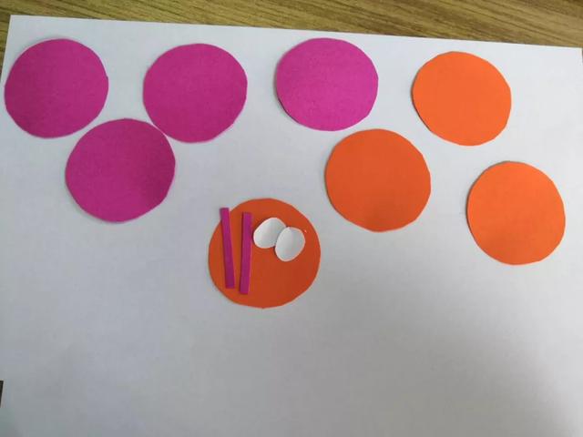 制作步骤:用玫红色卡纸和橙色卡纸剪八个圆下来;