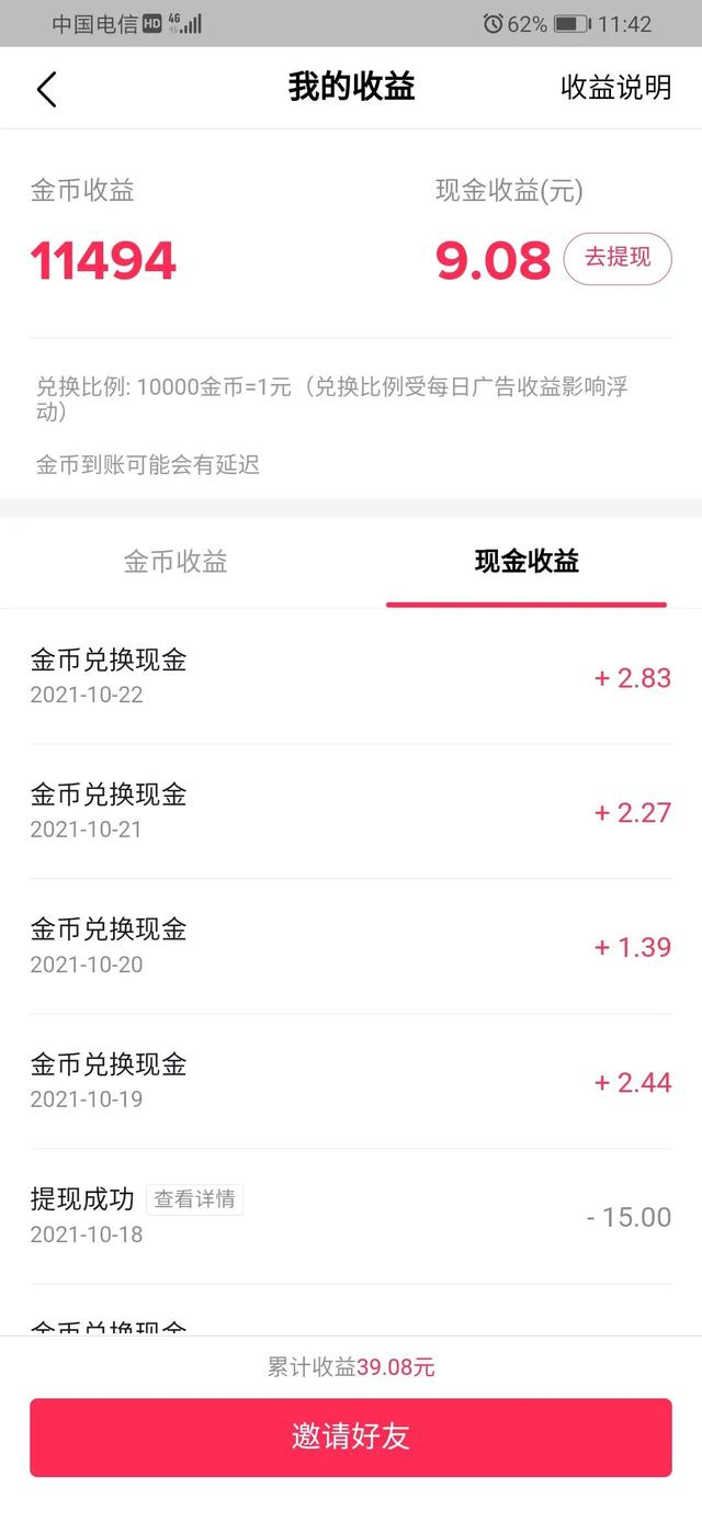 3、抖音极速版收益2.8元(花费时间大约两个小时,各种赚金币的方法都试了一遍,按要求拍视频和玩游戏赚金币比较快)。