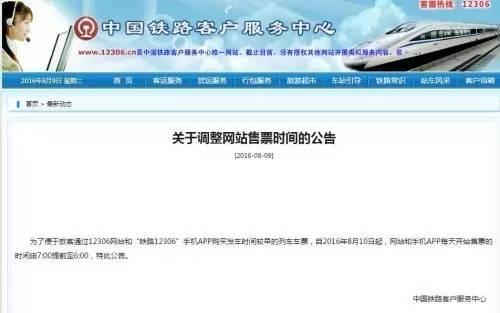 8月9日,中国铁路客户服务中心发布官方公告称,为了便于旅客通过12306网站和“铁路12306”手机APP购买发车时间较早的列车车票,自今日(2016年8月10日)起,网站和手机APP每天开始售票的时间由7:00提前至6:00。
