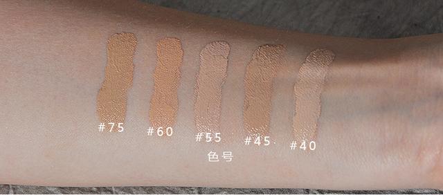 其中40#——含细微闪粉,欧美的底妆颜色稍偏暗的,因此喜欢白皙效果的MM可对实际色号选择哦颜色由白到暗分别是40#-55#-45#-60#-75#-65#