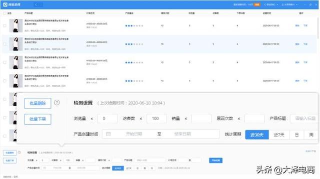 可以使用大泽商机助理【检测无流量产品】功能,检测近30天无流量产品,可快速进行批量下架和批量删除操作,提升店铺和产品权重,增加销量!