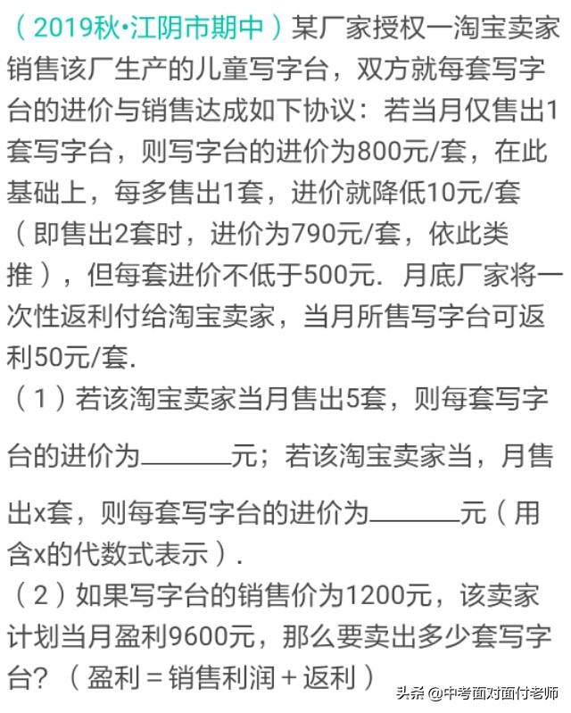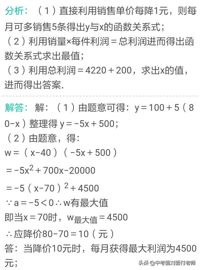 ②降价:意味着售价变小,数量变多。设利润为w,则w=(降价后的售价-进价)×数量(y=kx+b)=(降价后的售价-进价)×(降价前的数量+由于降价增加的数量)。