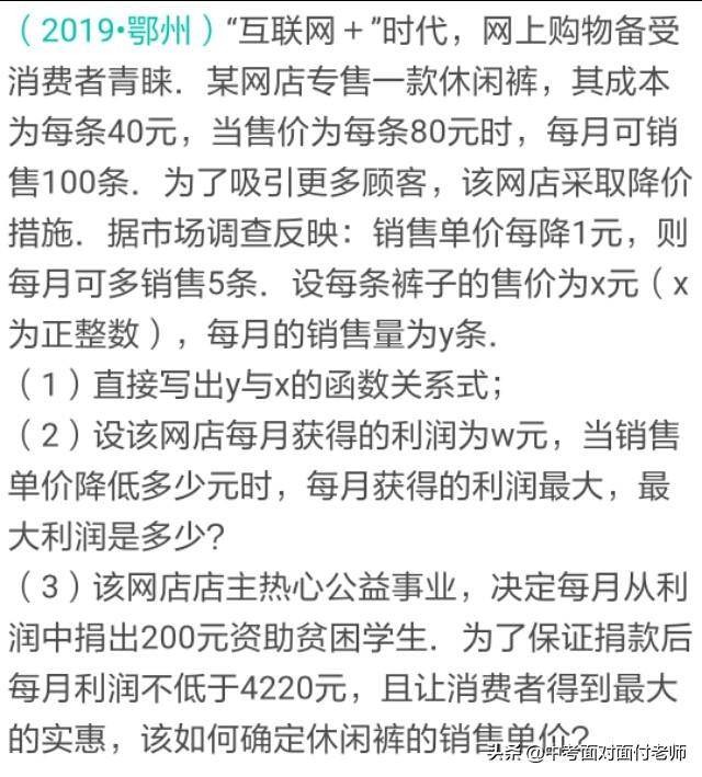 Ⅱ、二次函数应用题中的利润问题,一般涉及到的就是有两问,第一问求出售价与数量之间的函数关系式,这个题目会明确告诉你是一次函数,然后你利用题目所给条件求出一次函数解析式,注意最后自变量x一定要写出取值范围,这是送分题。
