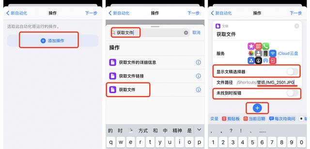 接着我们搜索并添加「获取文件」,这里我们将「显示文稿选择器」关闭,然后在下面粘贴刚才复制壁纸的名称,如果你新建了文件夹,那么就要先输入文件夹名称之后再粘贴,注意,名称后面要有这个“/”符号,下面「未找到时报错」的选项也可以选择关闭,完成以上操作之后我们在点击下面的“+”号图标。