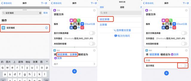 这里我们继续搜索并添加「设定墙纸」,这里我们点击“锁定屏幕、主屏幕”,进入后我们取消主屏幕的选项,随后我们点击下面的展开,关闭「显示预览」,点击「下一步」。