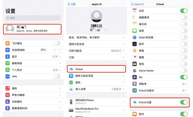 这里大家需要注意,如果你「iCloud云盘」的选项显示为灰色不能选择,那么我们需要前往手机的设置--个人 ID--iCloud,进入后我们将iCloud云盘打开即可。
