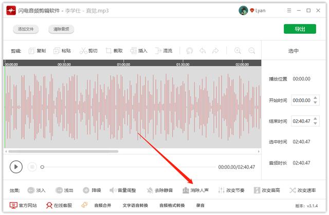 举一个例子,要是在音乐中想只要伴奏,那么就需要去除人声,很多人都不太清楚人声应该如何去除,在这里和大家讲解一下人声的去除方法,其实非常的简单,只需要选中导入的音频,点击“消除人声”,自行设置对应参数,即可消除人声,不过我们要记住的就是人声去除不可能完美无缺的,总会有些许的杂音。