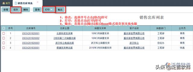 (3)、修改:选择要修改内容前的序号,再点击修改即可。比如:要修改一个销售出库的信息,选择该主题前的序号,然后再点击修改即可;或者双击该销售出库编号也可以进行修改