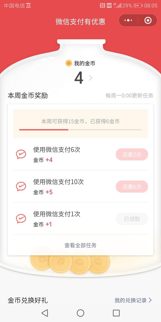 2、使用微信支付后(单笔消费金额满10元),就能领取任务相应的金币。每周最多领15金币(可以免费提现1500元)