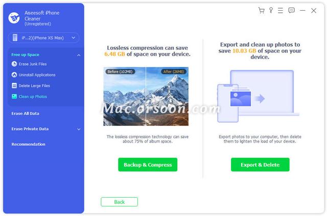 步骤 1。找到清理照片选项,然后单击擦除按钮扫描出 iPhone 上的垃圾文件。您还可以单击左侧面板中释放空间旁边的下拉箭头,然后选择清理照片选项以使用此功能。此功能提供了两个选项来很好地管理您的照片,例如备份和压缩以及导出和删除。