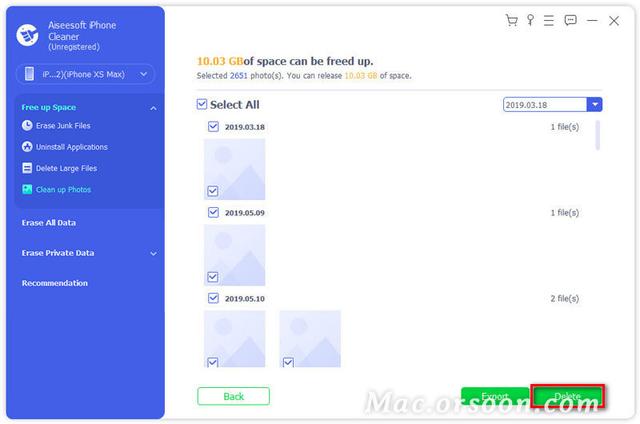 步骤 3.如果您想删除照片,您可以单击导出和删除按钮来备份或删除照片。您可以从右侧的下拉按钮中选择日期,然后通过时间线查找照片。然后会弹出提示。您可以单击确认按钮删除大照片。