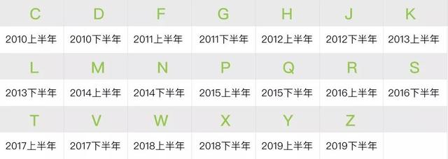 - 第四位为生产年份,用 20 个字母代替(26 个字母不包含 A,B,E,I,O,U),每半年一进位。