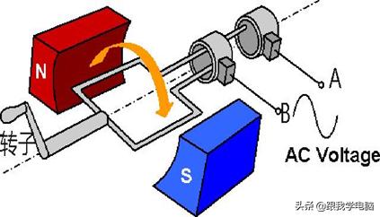 图1:手摇发电机组由转子/磁铁/线圈组成,只要手摇转子,A、B端就能产生交流电.