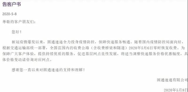5月8日,申通、圆通、百世等快递公司“不约而同”发布公告称,随着国内疫情防控局面向好,全国范围内的收费公路(含收费桥梁和隧道)于5月6日零时恢复收费,为保障末端网点有序复产、完善客户体验,促进基层网点良性发展,将适当调整快递服务价格优惠幅度,具体价格变动请咨询对应网点。