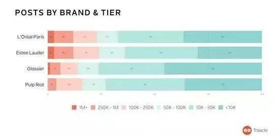 因此,大品牌也并不会被舆论的争执影响,他们一直对KOL和KOC进行分布式投放,不同平台的投放比例也有不同。自媒体刀姐doris发布的,欧莱雅、雅诗兰黛、网红品牌Glossier和美发品牌Pulp Riot在社交媒体投放时粉丝量级的分布图,就清楚地显示了这种趋势: