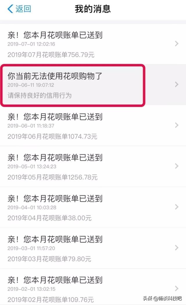 随后,该网友根据支付宝客服的建议,按照提示操作点开花呗页面右上角“信封标志”,查看了自己的花呗账单,发现里面出现了“你当前无法使用花呗购物了”以及具体被停用的时间。至于为什么花呗会被停用,原因如下,请大家仔细对照,看看自己是否存在被关停花呗功能的行为。