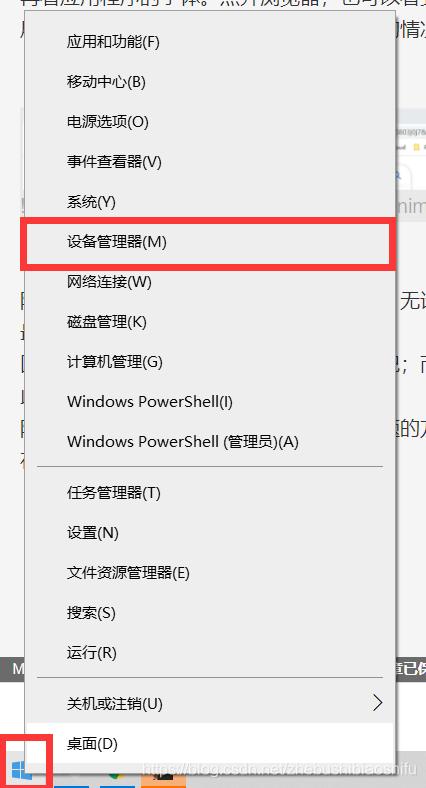 在开始菜单右键,选择“设备管理器”。