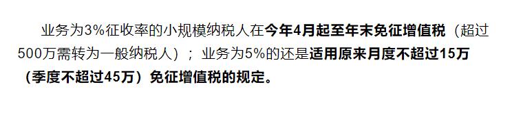 但是,适用5%征收率的业务,小规模纳税人的季度销售额超过45万需要缴纳税款,而未超过45万的话,仍可享受原来的免税政策。
