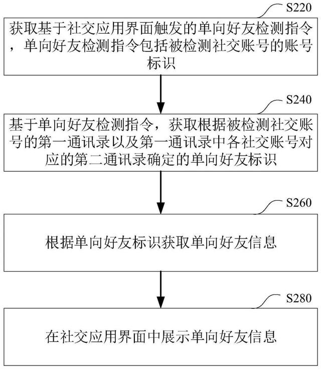 “所述方法包括:获取基于社交应用界面触发的单向好友检测指令,所述单向好友检测指令包括被检测社交账号的账号标识;