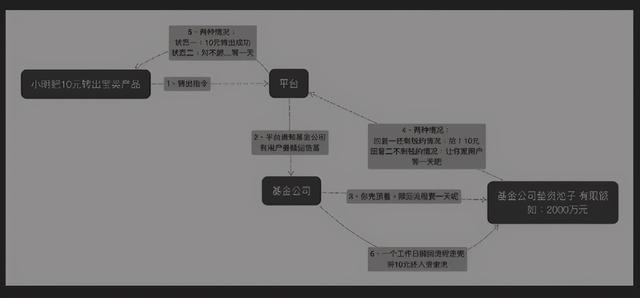 A:当然不是仅仅换个壳,举个简单例子,货币基金“赎回”绝对不是当天可以秒到的。之所以现在各类宝宝系都能做到快速“转出”,是因为基金公司或平台先垫钱给你了!(见图2-3中的第1~6步流程),不过这块垫资也是有限额的,一些宝宝类产品客服中心接到的投诉最多的就是“提现怎么还没到账啊!”——限额用完了呀!