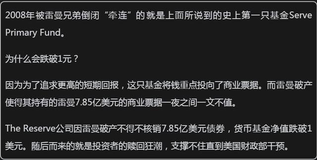 美国出现过这样的案例,2008年美国雷曼兄弟倒闭引发的市场恐慌性大额赎回让美国历史最悠久的货币基金陷入困境。