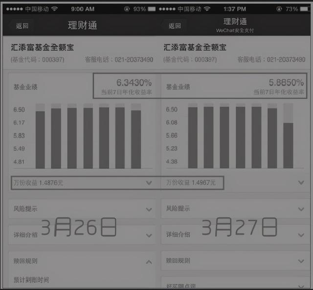很多人会纠结于选哪一只货基,有人说哪只收益高选哪只——虽然货基怎么选没太大差别,但光看列出的7日年化收益率还是很片面的,除了上述释放收益带来的不确定性,还有7日年化收益率其本身比较容易隐藏“收益下滑趋势”。那就以微信基金——汇添富全额宝为例,图2-5所示是我在2014年截取的前后两天的7日年化收益率对比:一个是6.23%,一个是5.88%,下降挺快的!