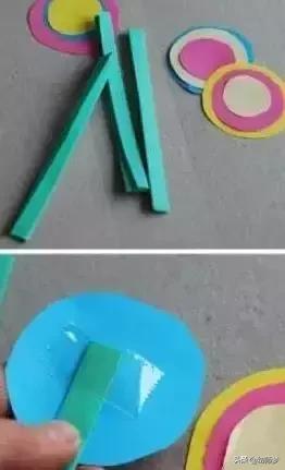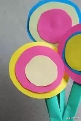 1:剪出各色大小不一的圆圈,对这些圆形进行组合拼贴做成圆形花瓣