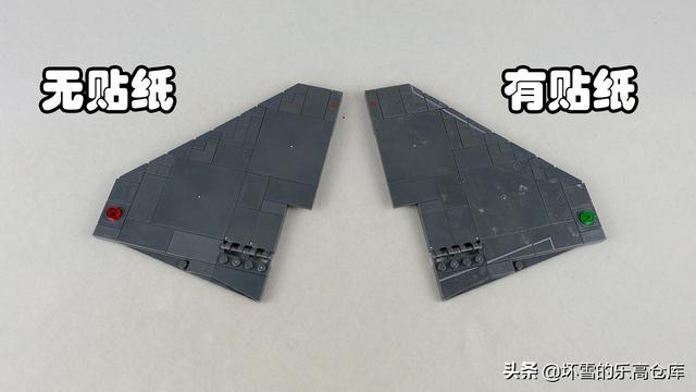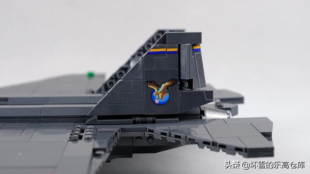 不知道出于何种考虑,森宝在整个机身和机翼上使用了大面积的透明胶贴,甚至6x6大光面板上的两个舱门细节也需要用到覆盖一整块零件的超大号胶贴,最直接的后果就是完全无法避免的气泡、指纹等问题,加上还不乏跨砖粘贴部分,整套贴纸的效果可以说惨不忍睹;除尾翼上的“鹘鹰”标识外,强烈建议弃用全机其余的所有胶贴。