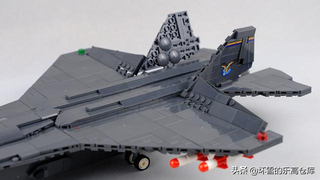 虽说原型是隐身战机,森宝还是为它配置了非常不隐身的翼下导弹和副油箱挂载。两发导弹的挂载相对牢靠,零件最多、最重的副油箱却只有一个凸点固定,把玩时相当容易掉落,个人也建议在平时把副油箱拆除。
